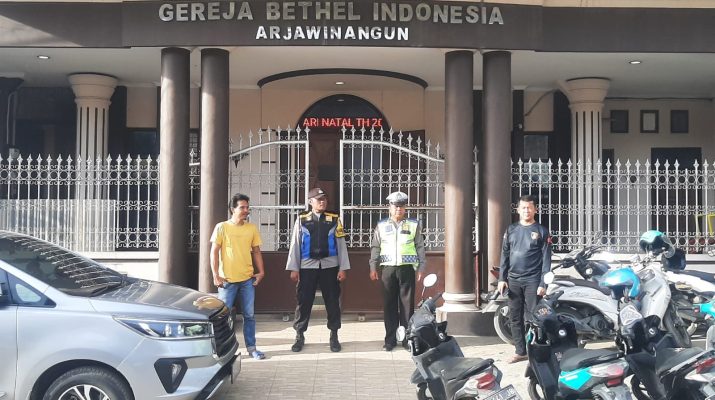 Arjawinangun, Mengantisipasi adanya gangguan Kamtibmas serta menciptakan situasi yang aman Anggota Polsek Arjawinangun Polresta Cirebon amankan kegiatan kebaktian umat Nasrani yang bertempat di Gereja Bethel Indonesia (GBI) – Arjawinangun yang berlokasi di Jalan Kantor Pos Desa Jungjang, Kecamatan Arjawinangun, Kabupayen Cirebon.
