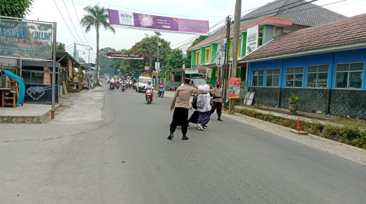 Giat pengaturan arus lalin tersebut dilaksanakan oleh Personil Polsek Dukupuntang yang telah terploting di depan SMK Manba’ul ‘Ulum Desa Sindangmekar Kecamatan Dukupuntang Kabupaten Cirebon, memperlancar arus lalu lintas dan membantu menyebrangkan anak sekolah.