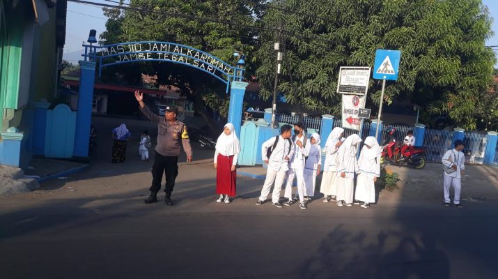 Anggota Polsek Plered melaksanakan Gatur Lalu lintas pagi di Jalan Otista di depan SDN 3 Tegalsari dan SMPN2 Plered Kec. Plered Kab. Cirebon