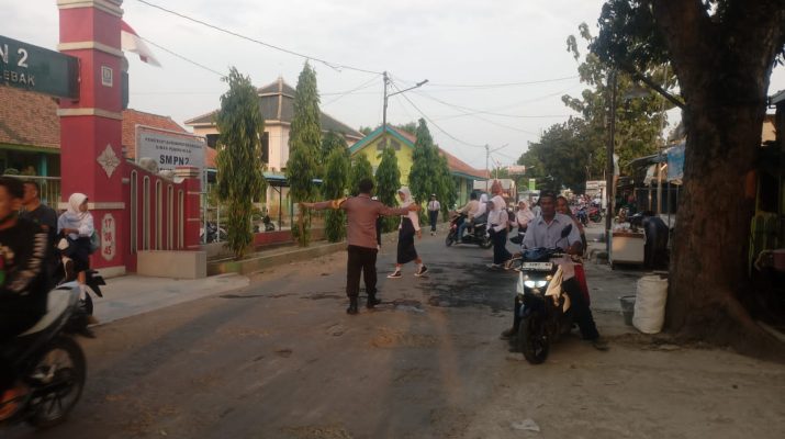 Berikan Rasa Aman dan lancar Unit patroli Polsek Susukan lebak lakukan gatur Lalulintas didepan SMPN Susukan lebak.