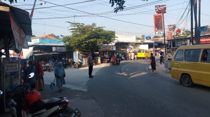 Sedong – Personil Polsek Sedong Polresta Cirebon Aipda Tarjim bersama Brigadir Susento dan Briptu Yoggi Iskandar melaksanakan Pengaturan lalulintas diPerempatan jalan Pasar Sedong tepatnya