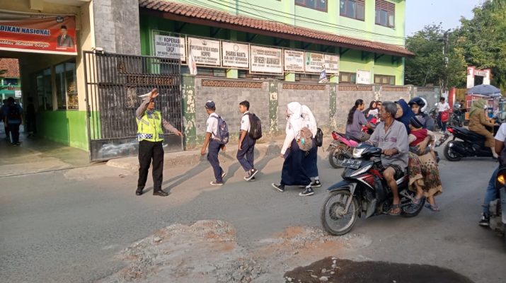 Rutinitas anggota Lalu lintas Polsek Arjawinangun Polresta Cirebon Gatur pagi di depan SMPN 1 Arjawinangun