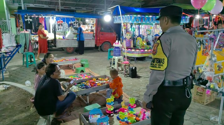 Lakukan Patroli Dialogis, Bhabinkamtibmas Polsek Pabedilan Polresta Cirebon sampaikan himbauaan pesan kamtibmas di pasar malam agar tetap menjaga Kondusifitas.
