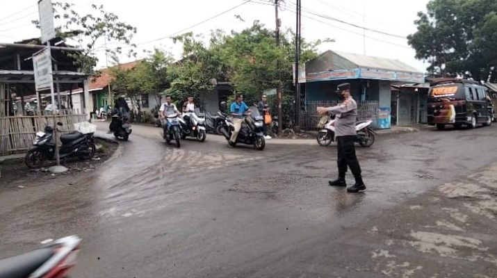 Respon Cepat Anggota Polsek Pabedilan Polresta Cirebon dalam Ciptakan situasi yang aman dan kondusif di jalan umum yang tergenang air dengan mengatur arus lalu lintas