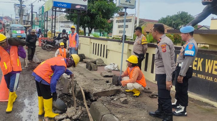 Kapolsek Weru, Kompol Sudarman menggandeng Dinas PUPR Kota Cirebon, untuk mengecek aliran air pada saluran depan Kantor Polsek Weru.