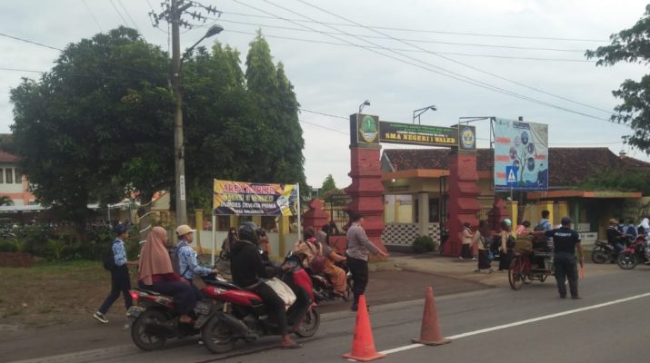 Ciptakan kelancaran dan kenyamanan kepada pengguna jalan umum, Patroli Polsek Waled melaksanakan pengaturan lalu lintas di depan SMA negeri 1 Waled