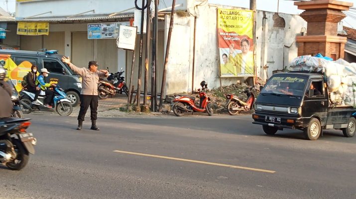 Jajaran Personil Polsek Ciwaringin Polresta Cirebon melaksanakan Gatur Lalu lintas pagi di Jalan raya Cirebon-Bandung tepatnya di pertigaan Rumas Sakit Sumber waras, Desa Ciwaringin Kec.Ciwaringin Kab. Cirebon.