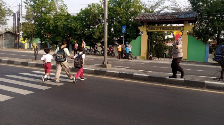 Anggota Polsek Plered  melaksanakan Gatur Lalu lintas pagi di Jalan  Otista di depan SDN 3 Tegalsari dan SMPN2 Plered Kec. Plered Kab. Cirebon