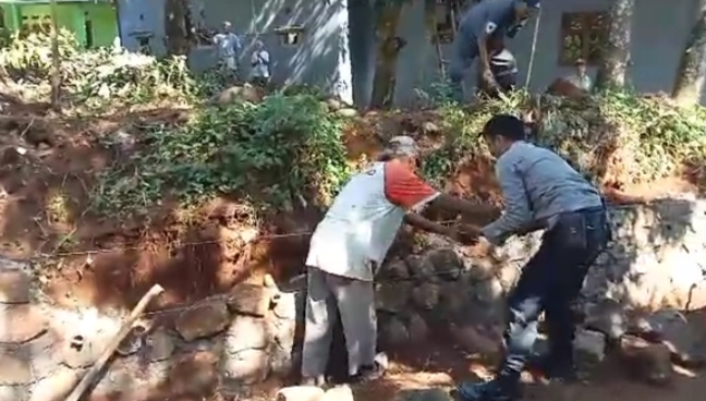 Kanit Binmas Bantu Warga Masyarakat Desa Cipinang Dalam Kerja Bhakti Pemasangan Senderan Di Tanah Desa