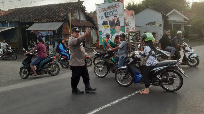 Jajaran Personil Polsek Susukan Polresta Cirebon Polda Jabar, melaksanakan Gatur Lalu lintas pagi di perempatan bunder Kec Susukan Kab Cirebon.
