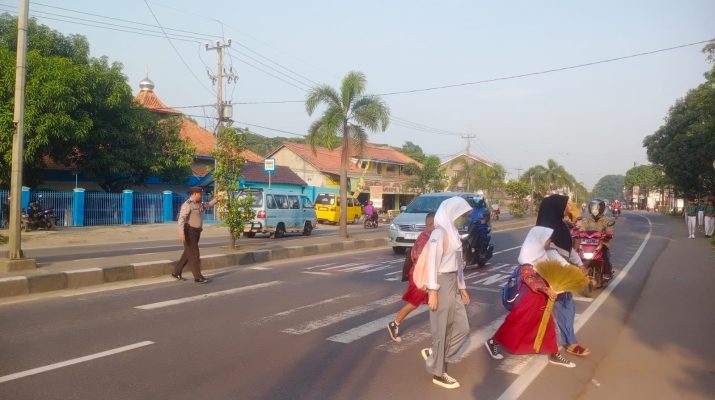 Jajaran Personil Polsek Plered Polresta Cirebon Polda Jabar, melaksanakan Gatur Lalu lintas pagi di Jaln Raya Otista tepatnya di depan SDN3 Tegalsari dan SMPN2 Plered Ds. Tegalsari Kec Plered Kab Cirebon.