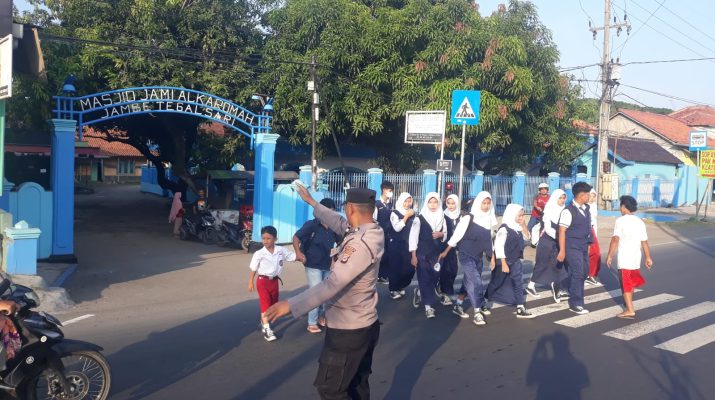 Anggota Polsek Plered melaksanakan Gatur Lalu lintas pagi di Jalan Otista di depan SDN 3 Tegalsari dan SMPN2 Plered Kec. Plered Kab. Cirebon