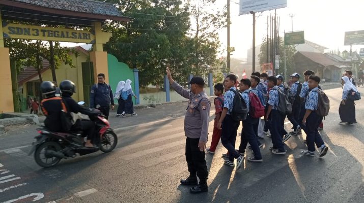 Polsek Plered melaksanakan Gatur Lalu lintas pagi di Jaln Raya Otista tepatnya di depan SDN3 Tegalsari dan SMPN 2 Plered Ds. Tegalsari Kec Plered Kab Cirebon.