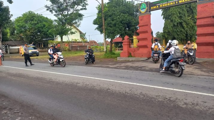 Prioritas kelancaran dan kenyamanan pengguna jalan umum, Patroli Polsek Waled Polresta Cirebon melaksanakan pengaturan lalu lintas di depan SMA negeri 1 Waled .
