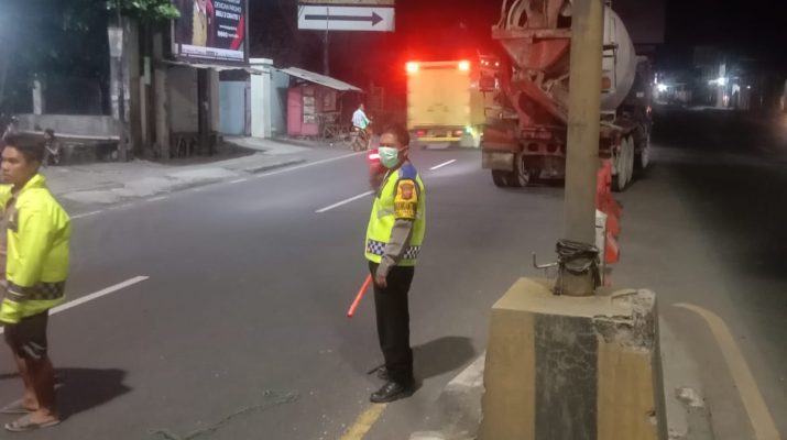 Losari, Personel Polsek Losari – Polresta Cirebon sigap membantu sebuah truk molen kendaraan mengalami mogok di pertigaan jalan Losari – Cirebon.