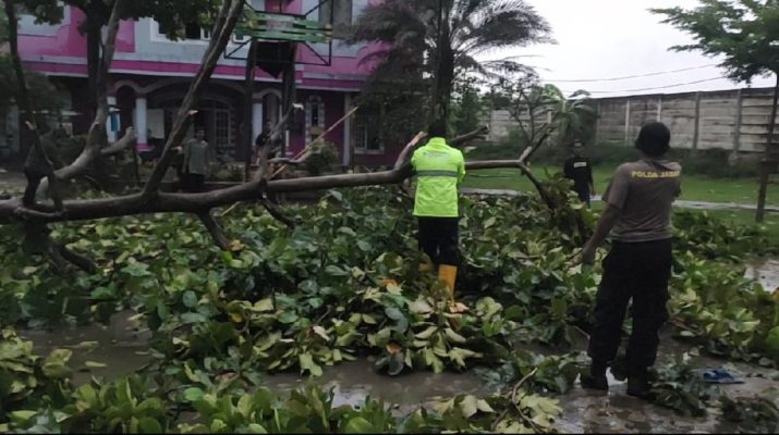 Personel Polsek Losari Polresta Cirebon terlihat dengan sigap melakukan pemotongan dan pembersihan ranting-ranting pohon yang menutupi jalan menggunakan alat mesin potong kayu dan alat yang lainnya.