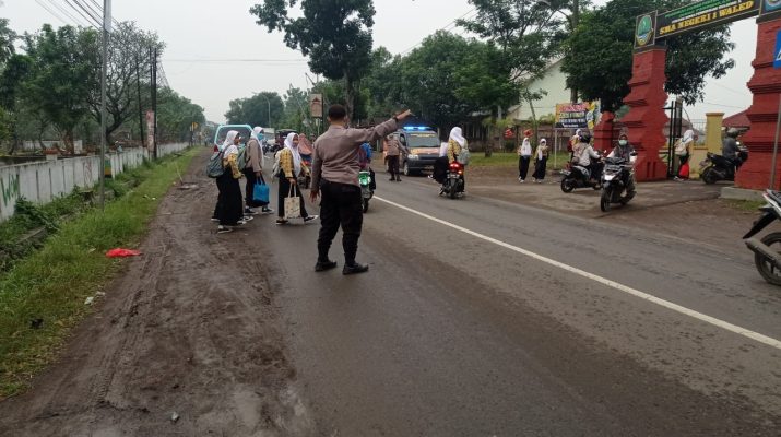 Personil Polsek Waled Polresta Cirebon melaksanakan pengaturan Lalu lintas di depan SMA dan SMP Negeri 1 Waled di Jalan Dewi Sartika Desa Waledkota Kec. Waled Kab. Cirebon