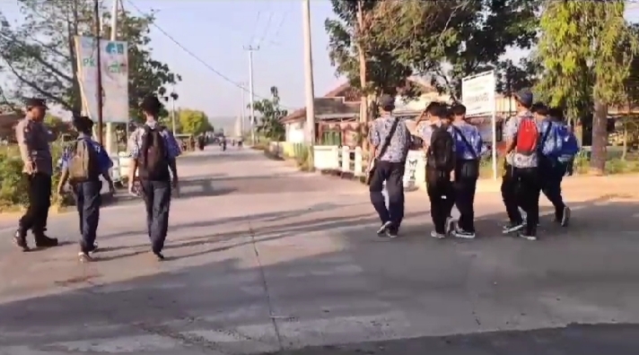 Personil Polsek karangsembung Polresta Cirebon melaksanakan Gatur Lalu lintas pagi di Jalan Karangwareng Kec. Karangwareng Kab. Cirebon