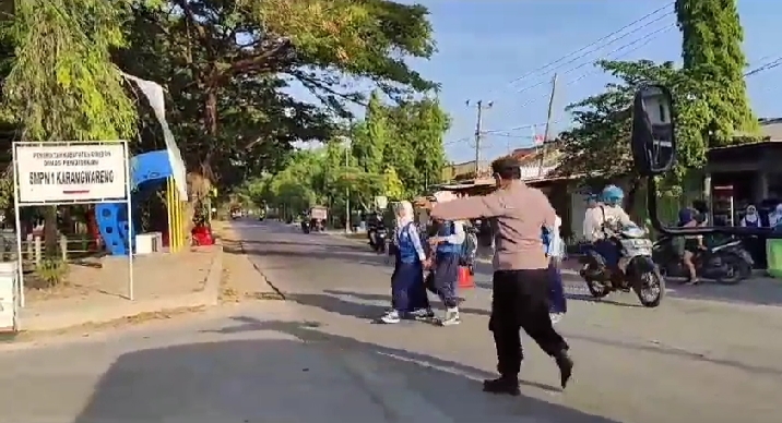 Personil Polsek karangsembung Polresta Cirebon melaksanakan Gatur Lalu lintas pagi di Jalan Karangwareng Kec. Karangwareng Kab. Cirebon