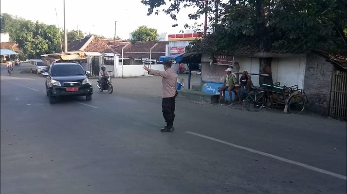 Personil Polsek karangsembung Polresta Cirebon melaksanakan Gatur Lalu lintas pagi di Jalan Karangwareng Kec. Karangwareng Kab. Cirebon