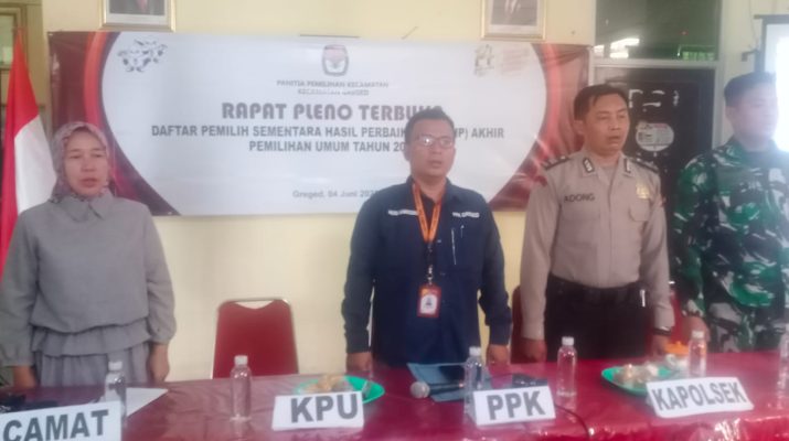 Dalam Rapat Pleno Terbuka Daftar Pemilihan Sementara Hasil Perbaikan di Kecamatan Greged dihadiri Oleh Camat Greged Ibu Ratna Kartika S. AP, Msi, Kapolsek Beber yang diwakili oleh Aiptu Khaer udin, Danramil Beber yang diwakili oleh Serma Tri, Ketua PPK dan dari KPU serta keterwakilan dari tiap- tiap Parpol. Kegiatan ini dilaksanakan pada hari Mnggu siang tanggal 04 Juni 2023.
