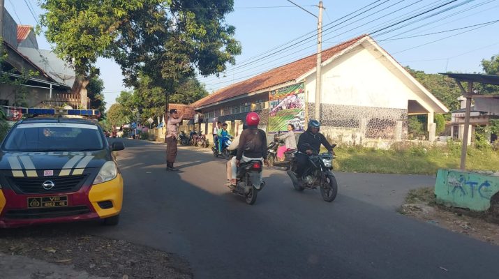 Anggota Polsek Sedong Polresta Cirebon Brigadir Susento dan Briptu Yoggi Iskandar melaksanakan Pengaturan lalulintas diPerempatan Jalan depan SMK Bina Bangsa dan perempatan Pasar Sedong tepatnya Desa Sedonglor Kecamatan Sedong Kabupaten Cirebon.