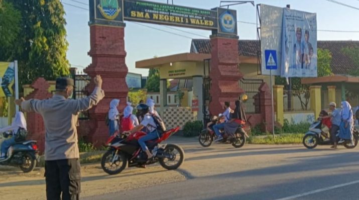 Giat pengaturan arus lalin tersebut dilaksanakan oleh Personil Polsek Waled yang telah terploting di depan SMA negeri 1 Waled Kecamatan Waled Kabupaten Cirebon, memperlancar arus lalu lintas dan membantu menyebrangkan anak sekolah.